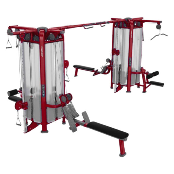 Equipo multifuncional que integra varias estaciones de trabajo en un solo sistema. Diseñado para optimizar espacio y permitir entrenamientos en grupo o individuales, con gran versatilidad para trabajar todos los grupos musculares.